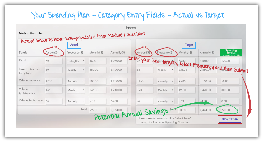 Best created on a desktop, the proprietary smart dashboard shows you what your ideal target expenses should be and once you have made some realistic changes, what your expenses target looks like.